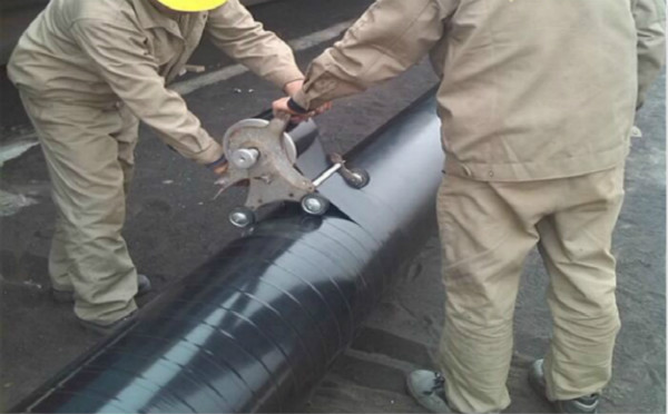 4)使用适当的机械或手动工具,在涂好底漆的管段上按搭接要求螺旋缠绕胶粘带,胶粘带应保持一定的拉紧涨力,使得胶粘带层紧密连接。边缝应平行,克服扭曲皱褶。