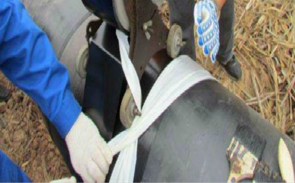 首先选好聚乙烯胶粘带的型号(厚度),较佳的厚度有薄胶型聚乙烯胶粘带0.6mm和厚胶型聚乙烯胶粘带1.20mm可选。对于薄胶型胶粘带在对需防腐蚀作业面处理后,涂刷配套底漆,再以搭接带宽的50~55%进行作业施工,使得防腐层厚度为薄胶型胶粘带0.6mm的2倍;另选1.20mm厚胶型胶粘带,同样是对需防腐蚀作业面处理后,涂刷配套底漆,再以搭接带宽的10~15%进行作业施工,使得防腐层厚度为厚胶型胶粘带1.20mm单层即可满足。