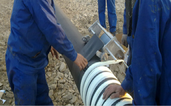 4、缠绕胶带以搭接带宽的50~55%进行,形成一遍两层,满足特加强级别,达到总厚度≥2.0mm。在施工过程中要增大特加强级聚乙烯胶粘带的平衡涨力,达到紧贴于表面,实现包平无空隙、无皱折效果。